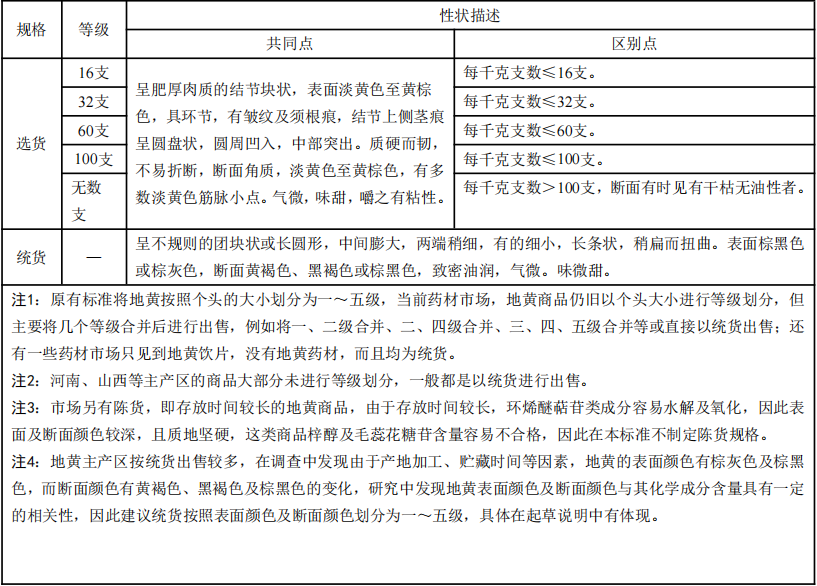 根据市场流通情况,对药材是否进行等级划分,将地黄分为“选货”和“统货”两个规格。