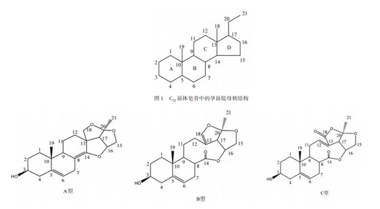 1、甾体皂苷苷元均以孕甾烷(图1)或其异构体为基本骨架,C、D环易发生变形,D环氧化成3个四氢呋喃环(A型)或苷元骨架中的六元C环和五元D环氧化断裂成九元环的饱和内酯(B型)及不饱和内酯(C型);
