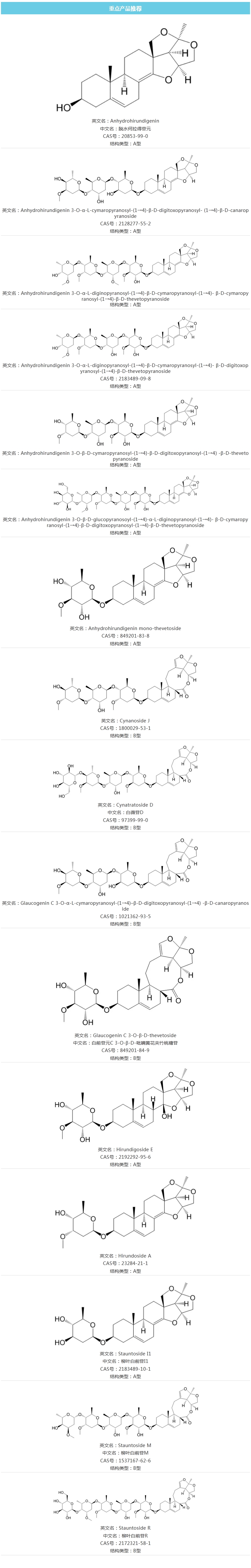 目前我司已有多种白前C21甾体皂苷类化合物,均为现货,其中绝大部分为独家化合物,欢迎咨询!