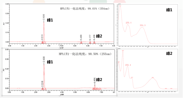 解决方案:选择对照品与杂质具有相似吸收特征的波长,纯度结果会更趋近真实值(如示图选择255nm检测)。