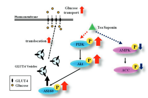2、抗糖尿病作用:茶皂素E1通过激活PI3K/Akt/mTOR信号通路,增加C2C12成肌细胞的葡萄糖摄取能力,改善肌肉能量代谢,降低血糖水平,对于Ⅱ型糖尿病具有潜在的治疗作用。