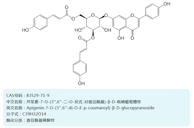 近年来,大量研究发现酰基化黄酮糖苷类化合物在许多植物药中广泛分布。相较于黄酮苷,酰基化结构稳定性与脂溶性更好,生物利用率高,疗效更显著;酰基修饰也正逐步成为药物研发领域的热点之一。酰基化黄酮苷主要具有以下生物活性: