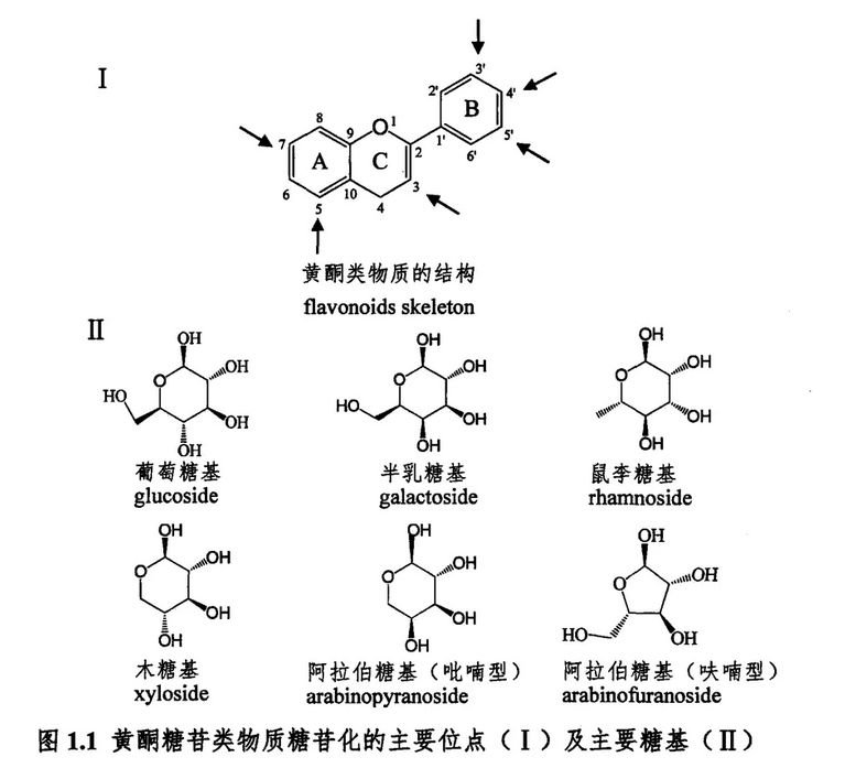黄酮糖苷主要是由黄酮基本骨架主要位置上的氧化作用所形成的。糖取代基多以氢氧化形式与黄酮碳骨架相连,形成O-糖苷,也有少数与黄酮A环上的C原子直接相连形成C-糖苷,如牡荆素、葛根素等。糖基主要包括葡萄糖、半乳糖、鼠李糖、木糖、阿拉伯糖等,且部分糖基有乙酰化、咖啡酰化、香豆酰化、没食子酰化等现象。