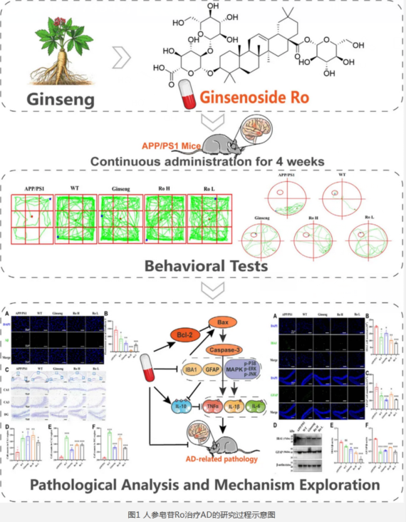 人参皂苷Ro通过减少Aβ沉积、改善神经元凋亡和神经炎症,以及调控MAPK通路来实现改善空间探索能力、记忆认知功能。具有开发成为AD治疗药物的潜力。[5][6]