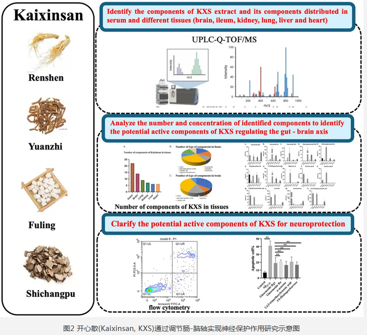 人参皂苷Ro作为开心散(Kaixinsan, KXS)的重要活性成分,通过调节肠-脑轴实现神经保护作用。为KXS在防治阿尔茨海默病、抑郁症等神经退行性疾病中的应用提供了理论依据。[7]