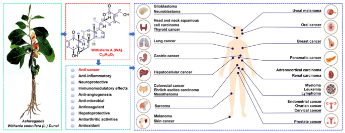 醉茄素A具有显著的多效性抗癌活性,实验证实其在乳腺癌、结肠癌、卵巢癌、神经胶质瘤等模型中可抑制肿瘤生长和转移(图1),且对正常细胞毒性较低。通过多靶点机制抑制肿瘤(图2、图3):