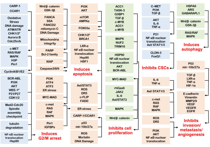 1.诱导细胞周期阻滞与凋亡:通过上调促凋亡蛋白(Bax、p53)和抑制抗凋亡蛋白(Bcl-2、Bcl-xL),激活线粒体途径和Caspase级联反应,导致癌细胞死亡;同时通过抑制CDK/cyclin复合物,阻滞细胞周期于G2/M期。[1]