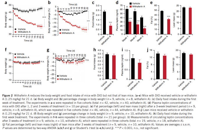 醉茄素A通过增强瘦素(leptin)敏感性显著改善饮食诱导肥胖(DIO)小鼠的代谢异常(图6)。此外,醉茄素A独立于瘦素增敏作用,直接改善葡萄糖代谢。为开发新型抗肥胖药物提供了新思路,具备临床转化潜力。[5]