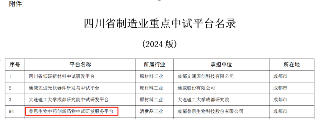 近日,四川省经济和信息化厅办公室印发《四川省制造业重点中试平台名录(2024版)》,成都普思生物科技股份有限公司的“普思生物中药创新药物中试研发服务平台”成功入选。