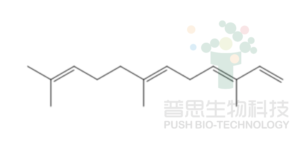 用途:茶、水果、花等多种植物的主要挥发性成分,呈花果香味,具有抗抑郁、抗菌消炎及自由基清除等活性,苹果、梨等水果的虎皮病与α-法尼烯代谢以及活性氧积累密切相关