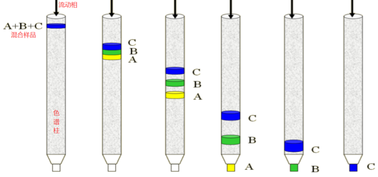 基于吸附色谱,即利用混合物中各组分在两种不相混溶的相(固定相和流动相)之间分配平衡的差异,从而实现分离。一般极性大的化合物与硅胶的吸附作用强,不容易被洗脱下来,在柱中移动得慢;极性小的化合物与硅胶吸附作用弱,容易被溶剂洗脱下来,移动得快。从而实现按极性从小到大依次被洗脱分离。