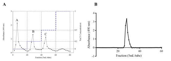 (A)DEAE Sepharose FF离子交换柱洗脱图 (B)Sephadex G-100 柱纯化图