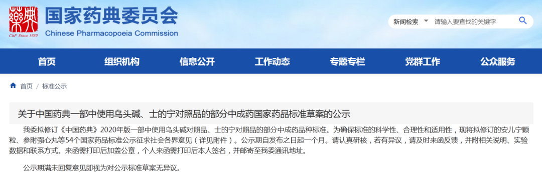 重磅更新丨国家药典委员会拟修订《中国药典》2020年版一部中使用乌头碱对照品、士的宁对照品的54个中成药品种标准