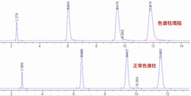 原因:长期使用后的色谱柱可能出现填料塌陷、污染等问题,导致固定相吸附点位不均匀,从而影响对照品的保留和分离,产生拖尾或前沿峰。