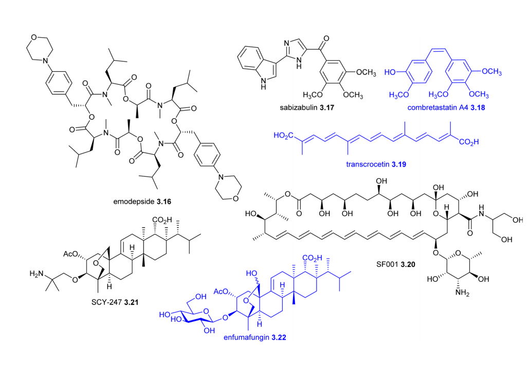 ·感染性疾病:抗菌药结构与机制多样,那非霉素已在印度获批,培西加南提交中国新药申请,新型作用机制化合物(如 Zaloganan、EBC-1013)受关注;抗寄生虫、抗病毒、抗真菌药物均有候选化合物推进,Sabizabulin 在 COVID-19 相关 ARDS 试验中死亡率降低 24.9%。